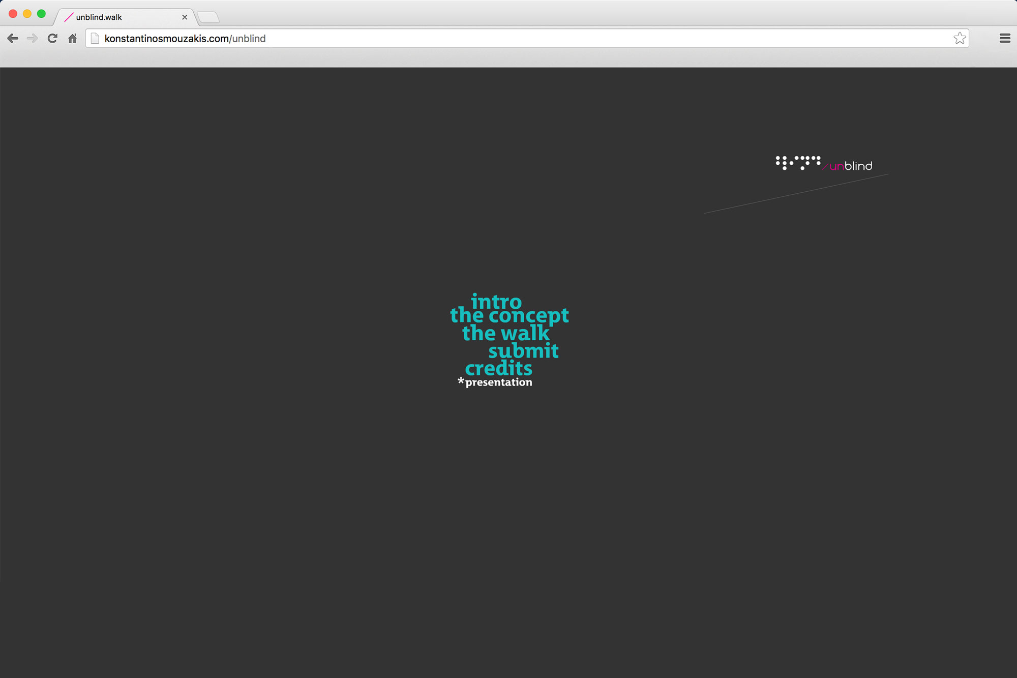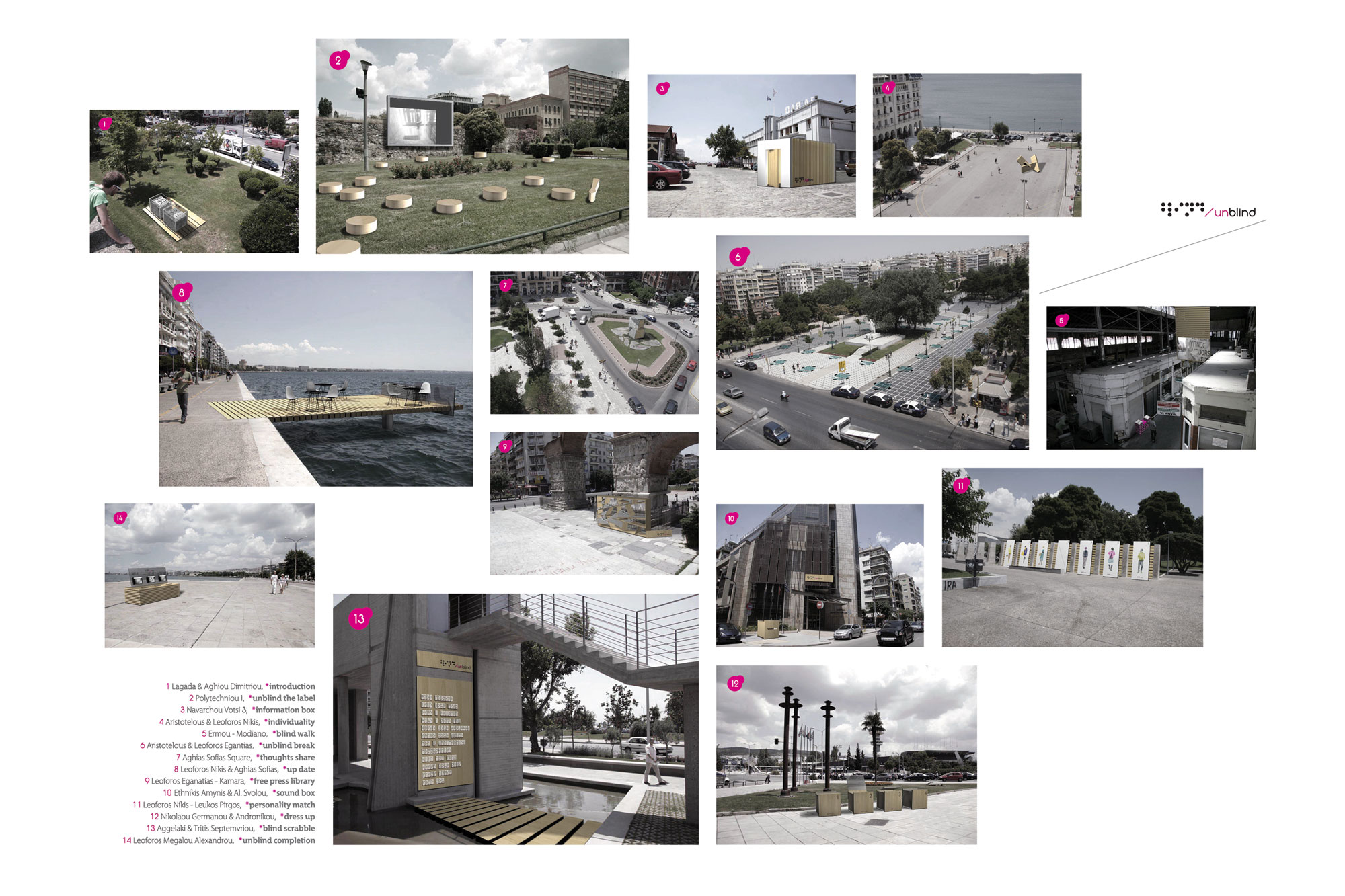 Unblind was presented at TEI of Athens as well as at the Greek Graphic Designers Association on November 2010 and has won a place on the architectural competition WeMe Archiving Collectivity for Thessaloniki on June 2011. The project features a dedicated website accessible using the link provided above.