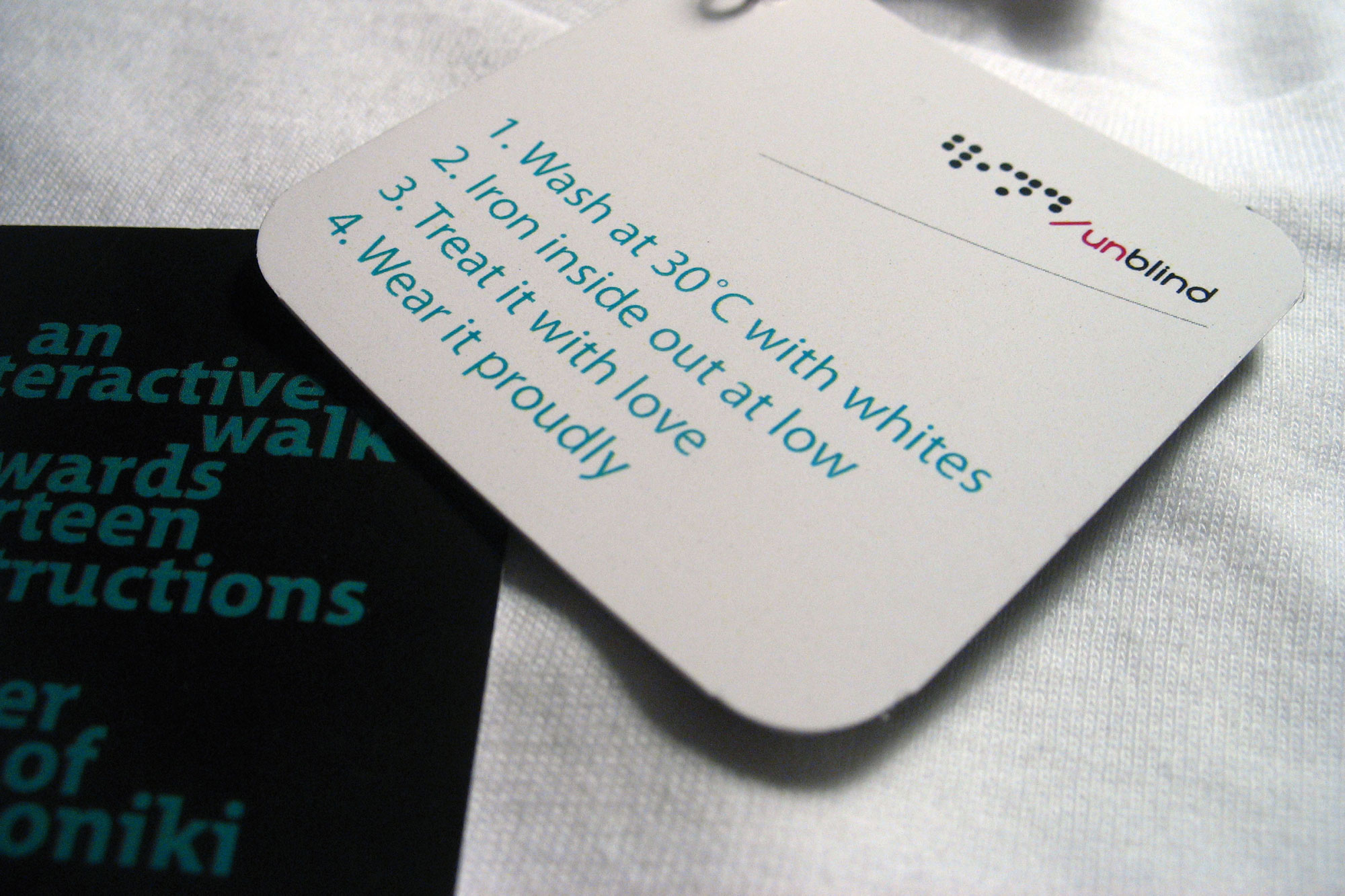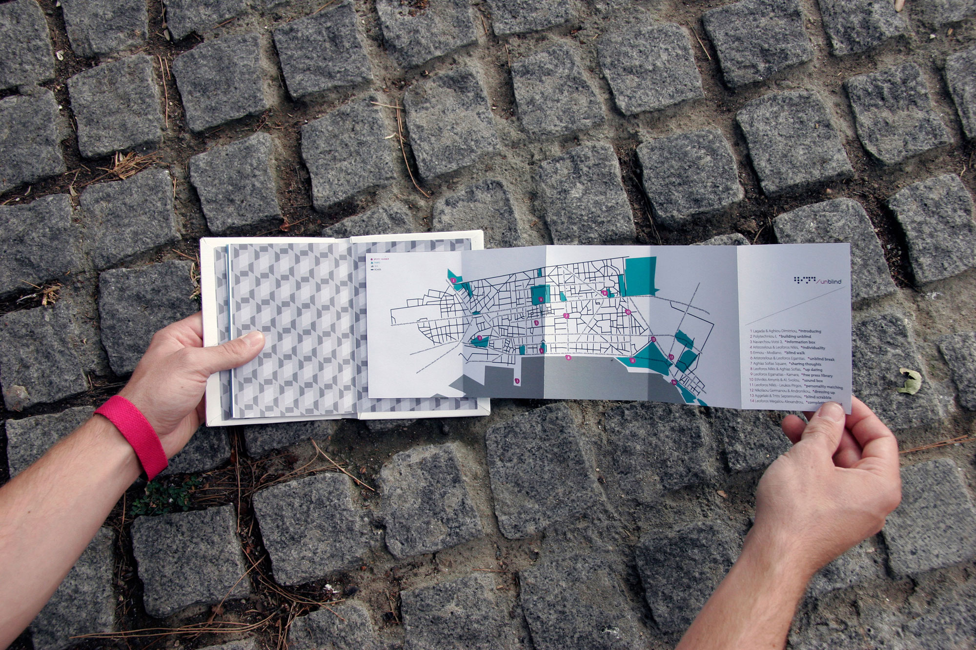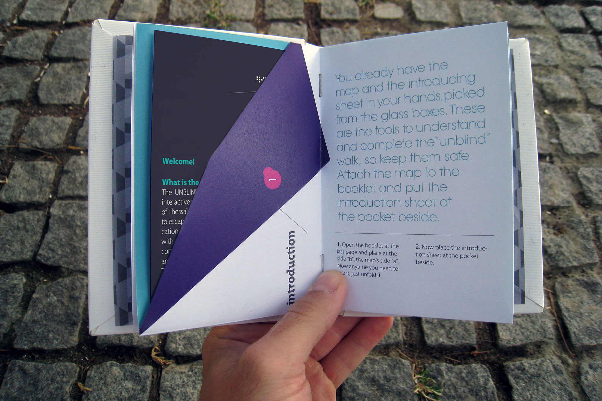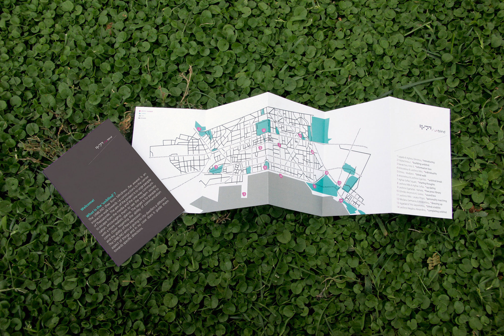 Unblind is an interactive walk towards fourteen constructions at the center of Thessaloniki. The aim of the project is to urge people to escape from the media and the one-way communication, encouraging them to see the modern society with a more realistic glance. The aim is for people to come closer regaining the ability of free expression and communication. Unblind constitutes Konstantinos Mouzakis' BA thesis for the TEI of Athens (BA Graphic Design).
