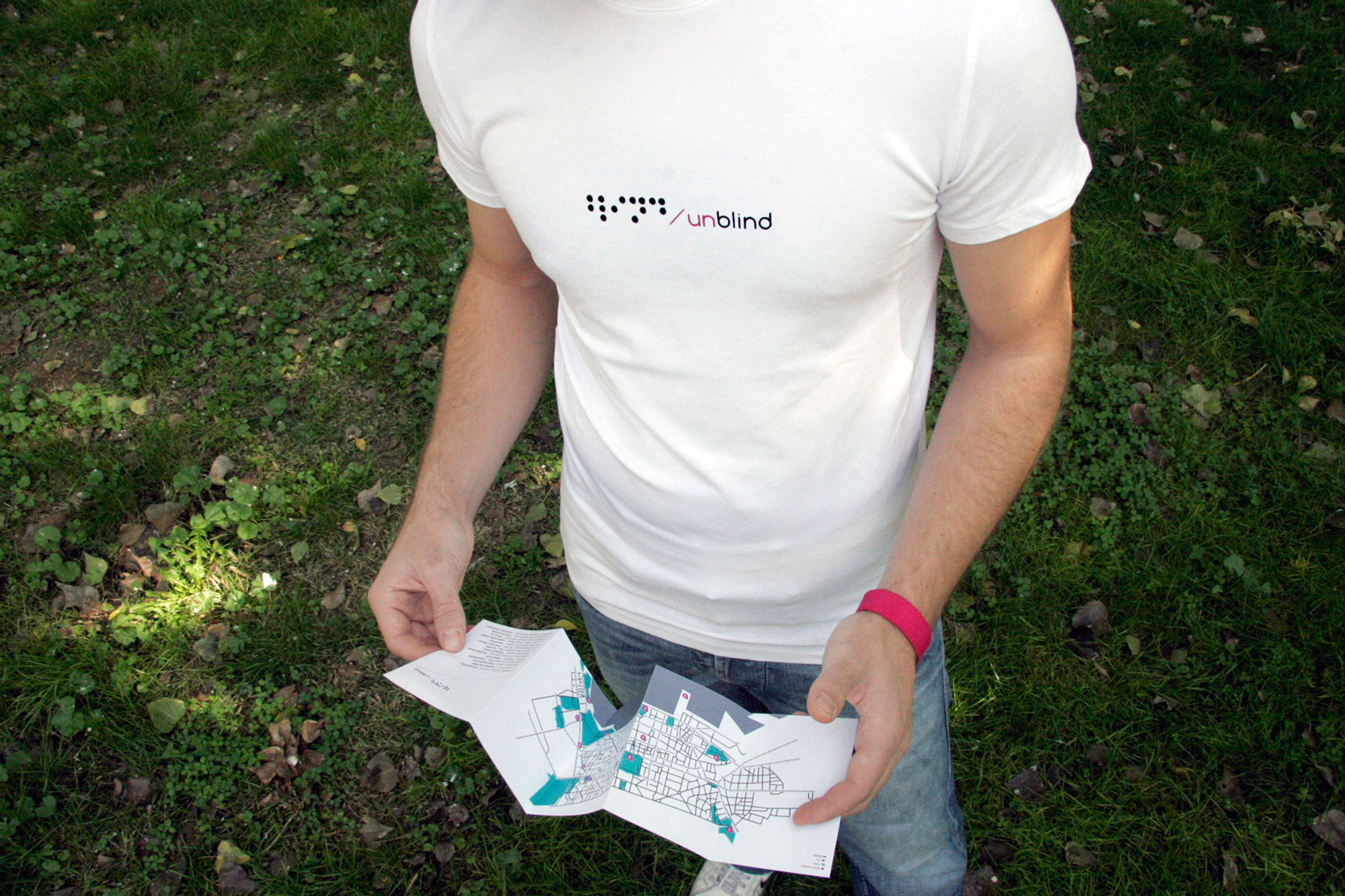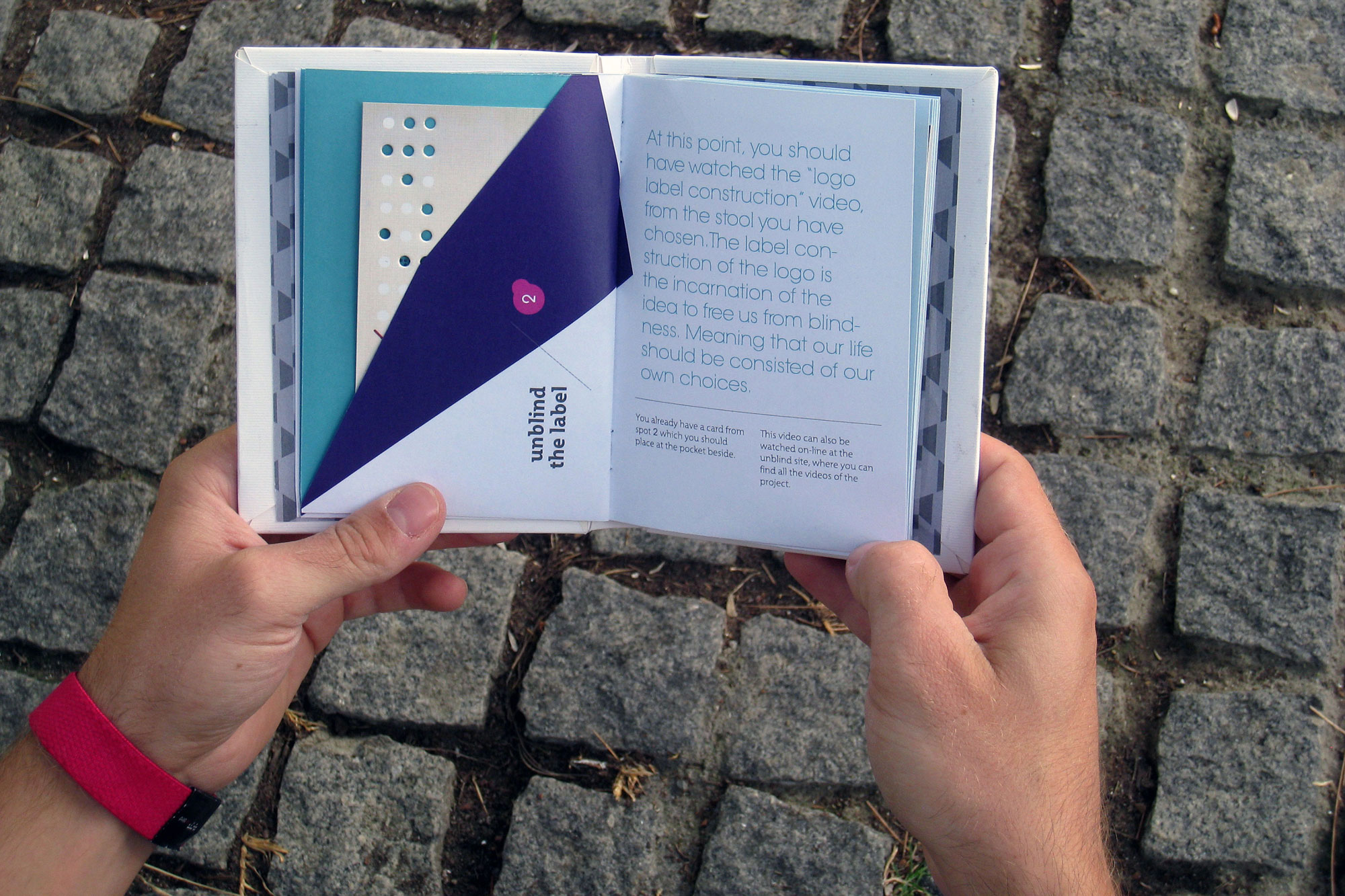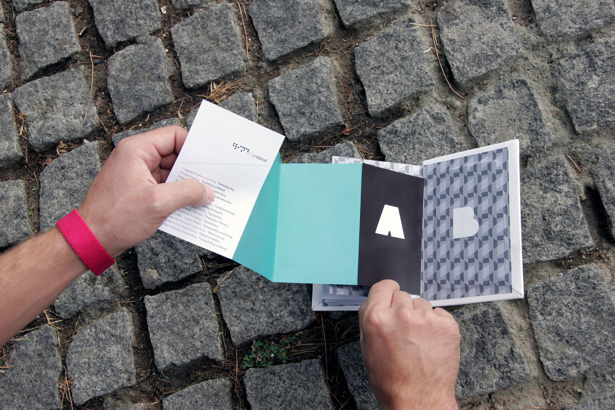 Unblind is an interactive walk towards fourteen constructions at the center of Thessaloniki. The aim of the project is to urge people to escape from the media and the one-way communication, encouraging them to see the modern society with a more realistic glance. The aim is for people to come closer regaining the ability of free expression and communication. Unblind constitutes Konstantinos Mouzakis' BA thesis for the TEI of Athens (BA Graphic Design).